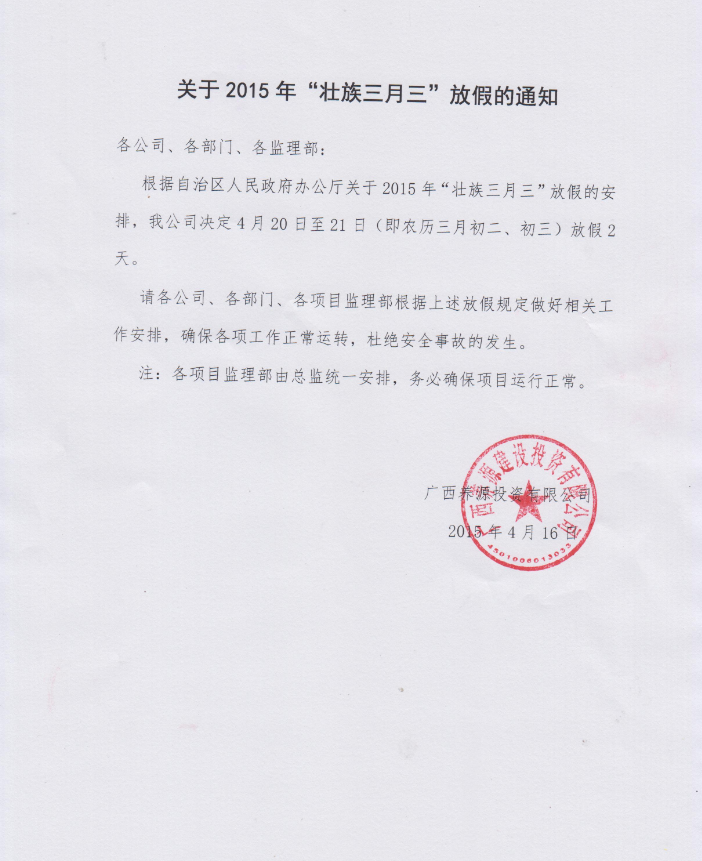 關(guān)于2015年“壯族三月三”放假的通知