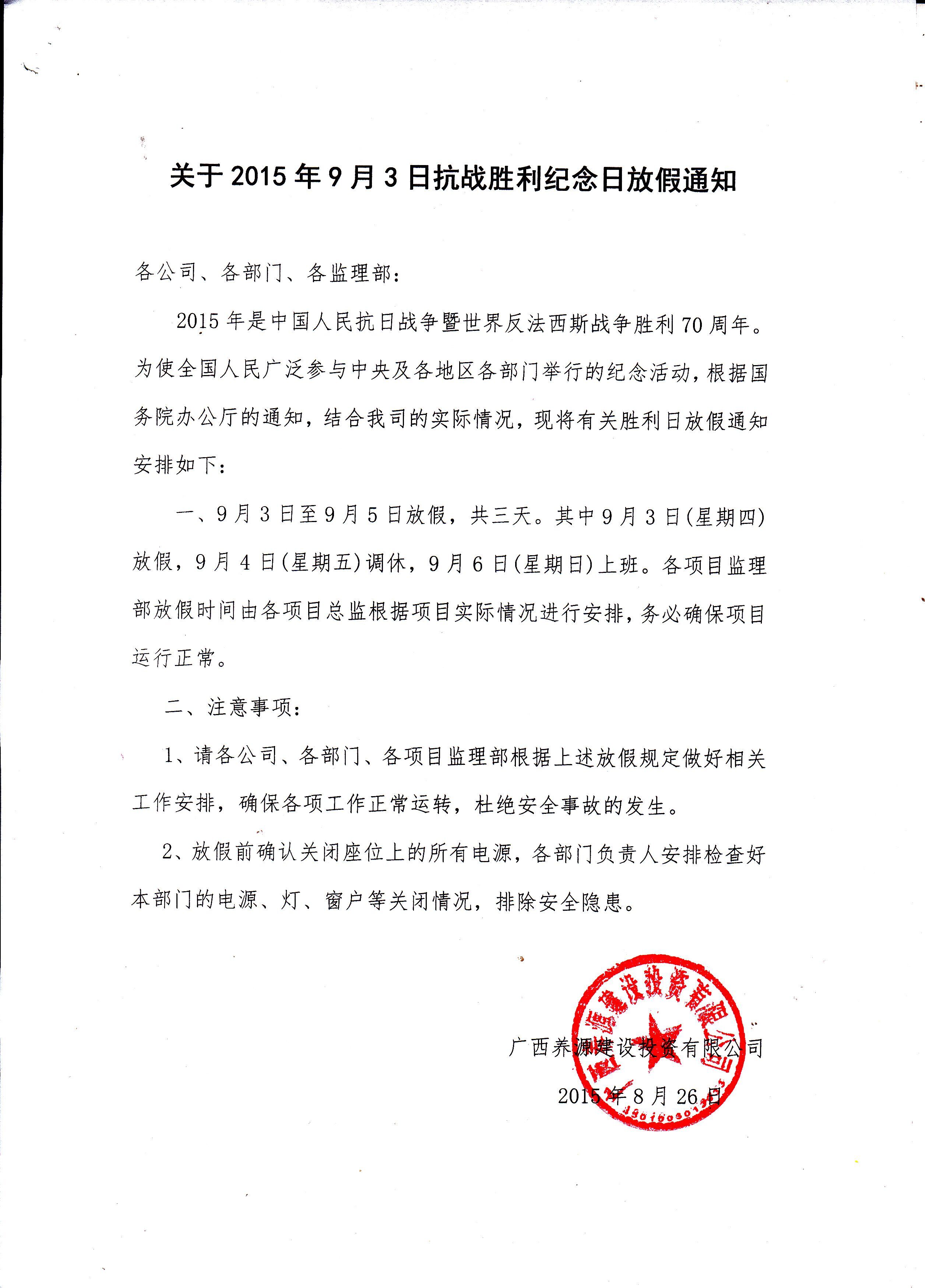 關(guān)于2015年9月3日抗戰(zhàn)勝利紀(jì)念日放假通知