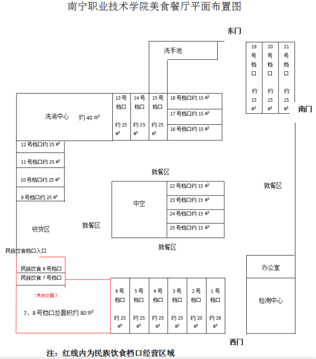 本項目檔口位于南寧職業(yè)技術(shù)學(xué)院美食餐廳內(nèi),面積約8-80㎡不等(詳見附件1)。